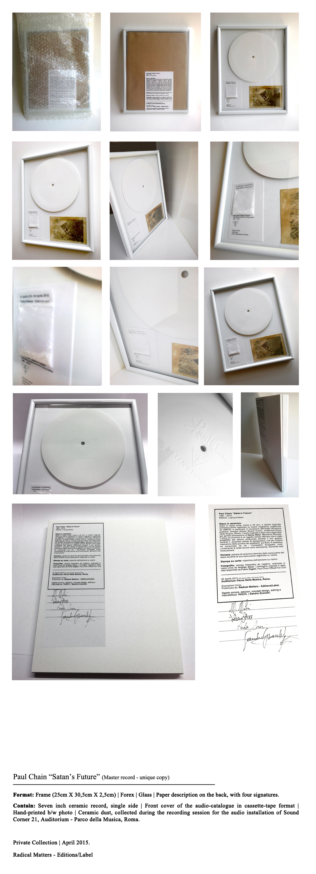 I. Disco in ceramica: disco in copia unica, inciso a 45 rpm, master originale dell’esecuzione registrata su nastro magnetico, pubblicata da RMEDL e realizzata in occasione dell'audio diffusione pubblica, tenutasi presso Sound Corner, Auditorium -Parco Della Musica, Roma. L’audio originale è stato reso disponibile per gentile concessione di Marco Melzi, Minotauro Records. Il disco di ceramica è un oggetto sonoro effimero che è stato progettato per essere consumato durante il suo ascolto, durante il processo stesso di riproduzione, che per frizione meccanica della puntina del giradischi, sul disco in ceramica, ha consumato via via i microsolchi fonografici incisi. Lentamente le onde sonore sono scomparse, lasciando solo muta polvere.